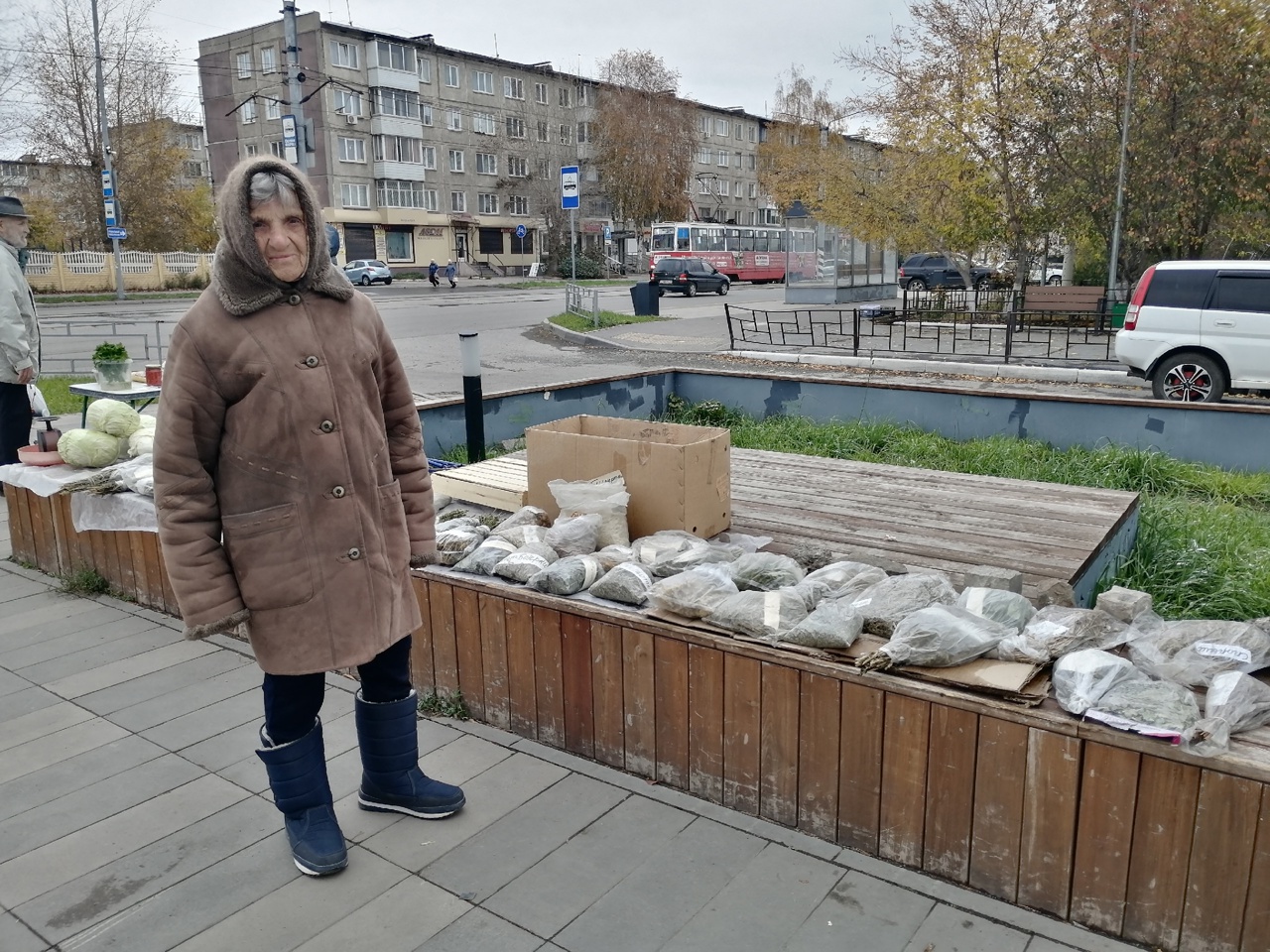 Понедельник, два часа дня, на улице – 0 градусов. Прилавки социального рынка в девятом микрорайоне по традиции пустуют – лишь одинокий торговец одеждой выставил тут свой товар. Корифеи торговли предпочитают ставить свои столы поближе к людям – у тротуара. Подхожу к скамейкам на площадке возле ЦУМа. Здесь расположились всего три продавца: предлагают поздние огурчики, помидоры, травы.