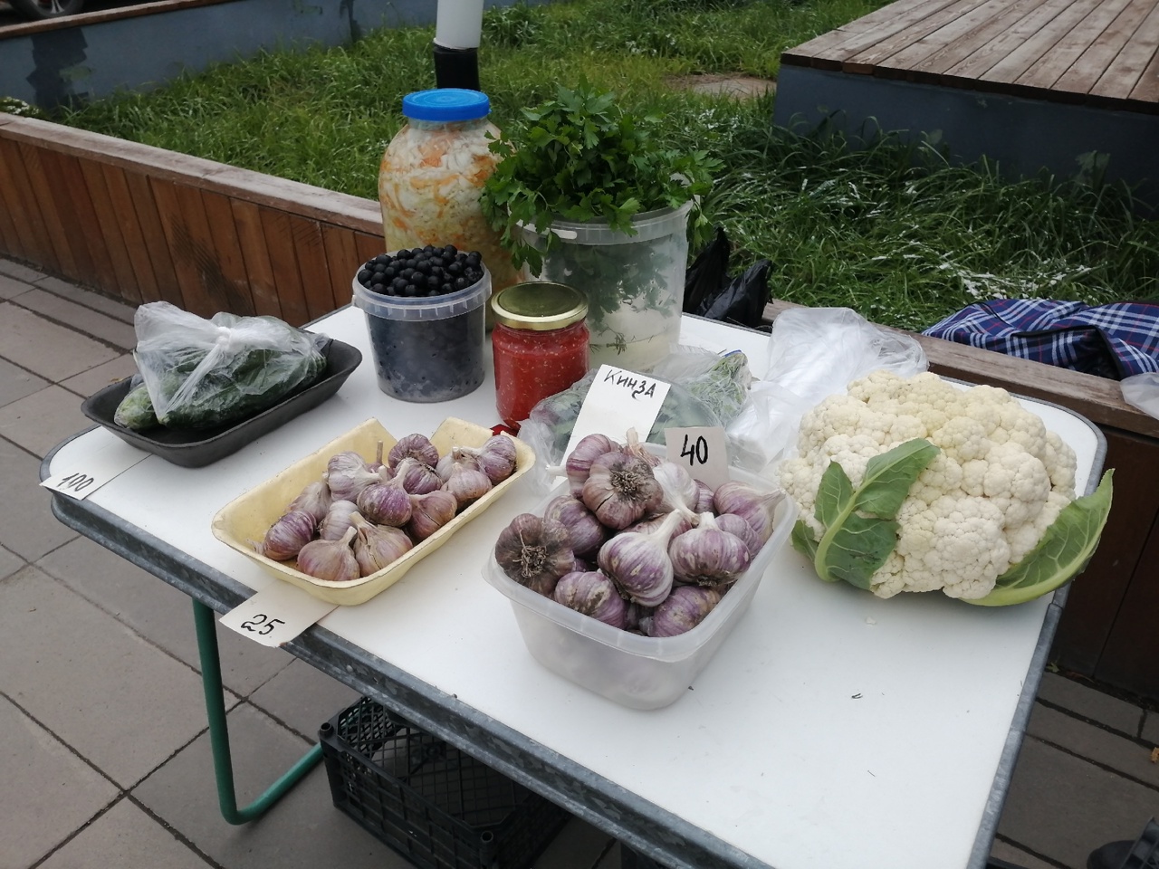 — Белокочанная – 50 рублей за килограмм, цветную отдам за 320 рублей – тут 1,6 кг, – отвечает женщина, представившаяся Натальей. На вопрос, где выращивает овощи (а нам исключительно важна экологическая составляющая продуктов), говорит, что в Каменке. Вариант устраивает, и мы берём цветную капусту, а в придачу ещё и кинзу (50 рублей). Также у Натальи на прилавке красуются огурчики – 100 рублей за полкило, чеснок – по 25 и 40, горлодёр – 200 рублей за 0,5 л, квашеная капуста – 400 рублей за трёхлитровую банку, черноплодная рябина – 100 рублей за литр.