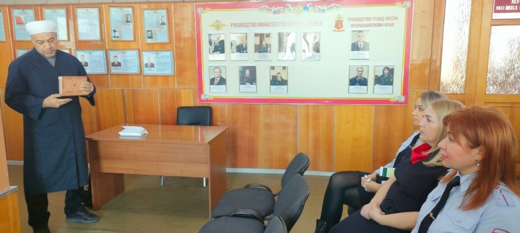 В МО МВД России «Ачинский» прошла встреча сотрудников полиции с местным имамом Равилем Минулиным, который рассказал об основах веры, терпимости, толерантности, подчеркнув, что служители закона несут свою службу и ответственность не только перед гражданами, но и перед Всевышним. Также он рассказал об опасности подмены традиционных ценностей ислама псевдорелигиозными учениями, проповедующими насилие.