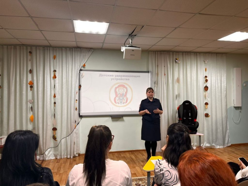 Сотрудница полиции проинформировала присутствующих о видах детских удерживающих устройств и отметила, что автокресло необходимо подбирать с учётом роста и веса ребёнка. Также напомнила родителям, что на заднем пассажирском сиденье необходимо перевозить детей в детском удерживающем устройстве до 7 лет, а на переднем пассажирском сиденье — до 12-летнего возраста.
