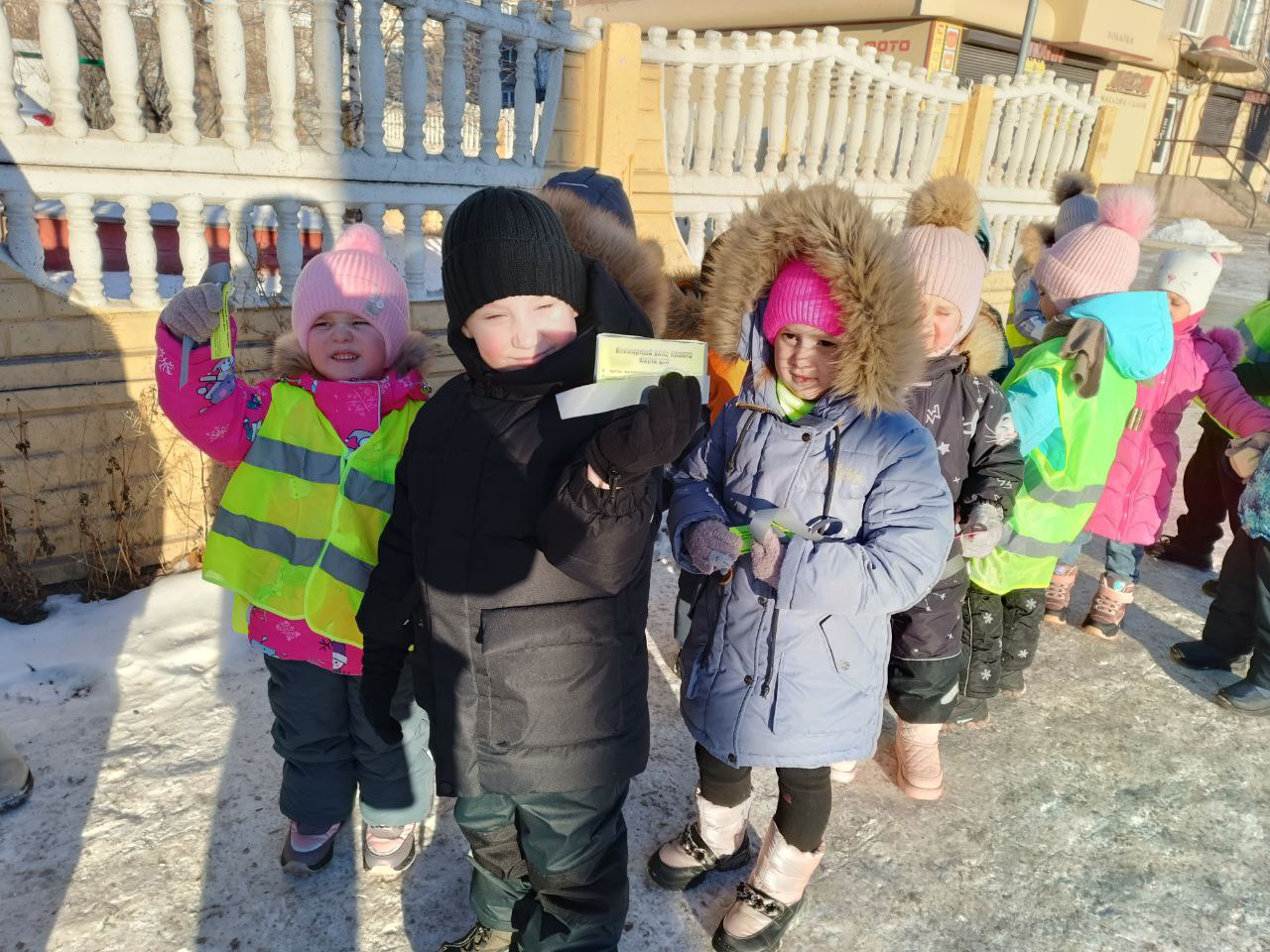 Ребята совместно с воспитателями накануне подготовили информационные карточки для пешеходов, в которых написали, что необходимо соблюдать ПДД, беречь свою жизнь и быть внимательными на дороге.
