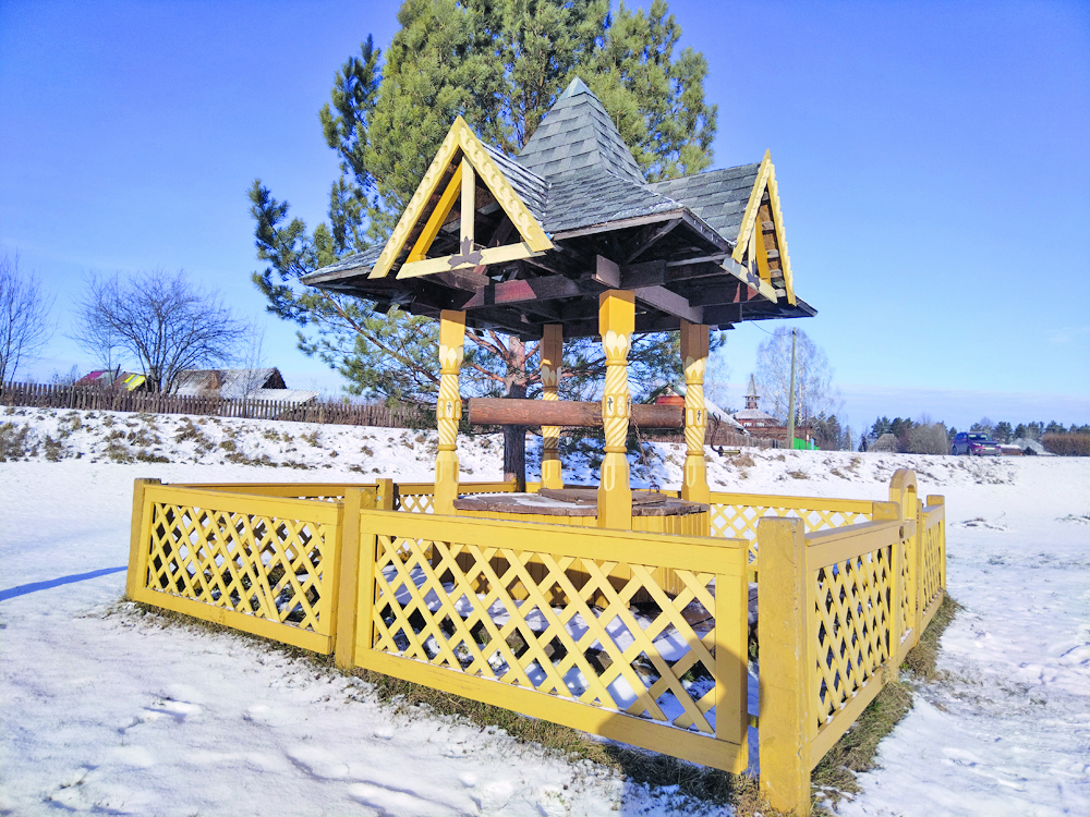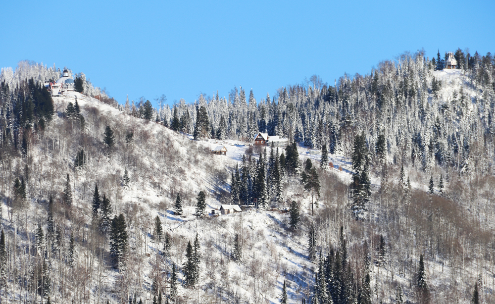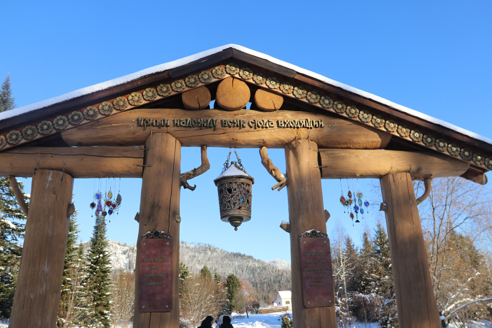 В этой деревне путешественников встретил величественный храм, сделанный из натуральных материалов. Он совсем не отапливается, и пока снаружи – красиво, внутри – очень холодно. Время приближалось к обеду, звучал колокол, призывая местных жителей, входящих в общину, принять участие в литургии. Приезжие виссарионовцы давно вросли в эти пространства, привнесли свой колорит, отличить от коренных жителей их можно по белой одежде, в которой они ходят на собрание.