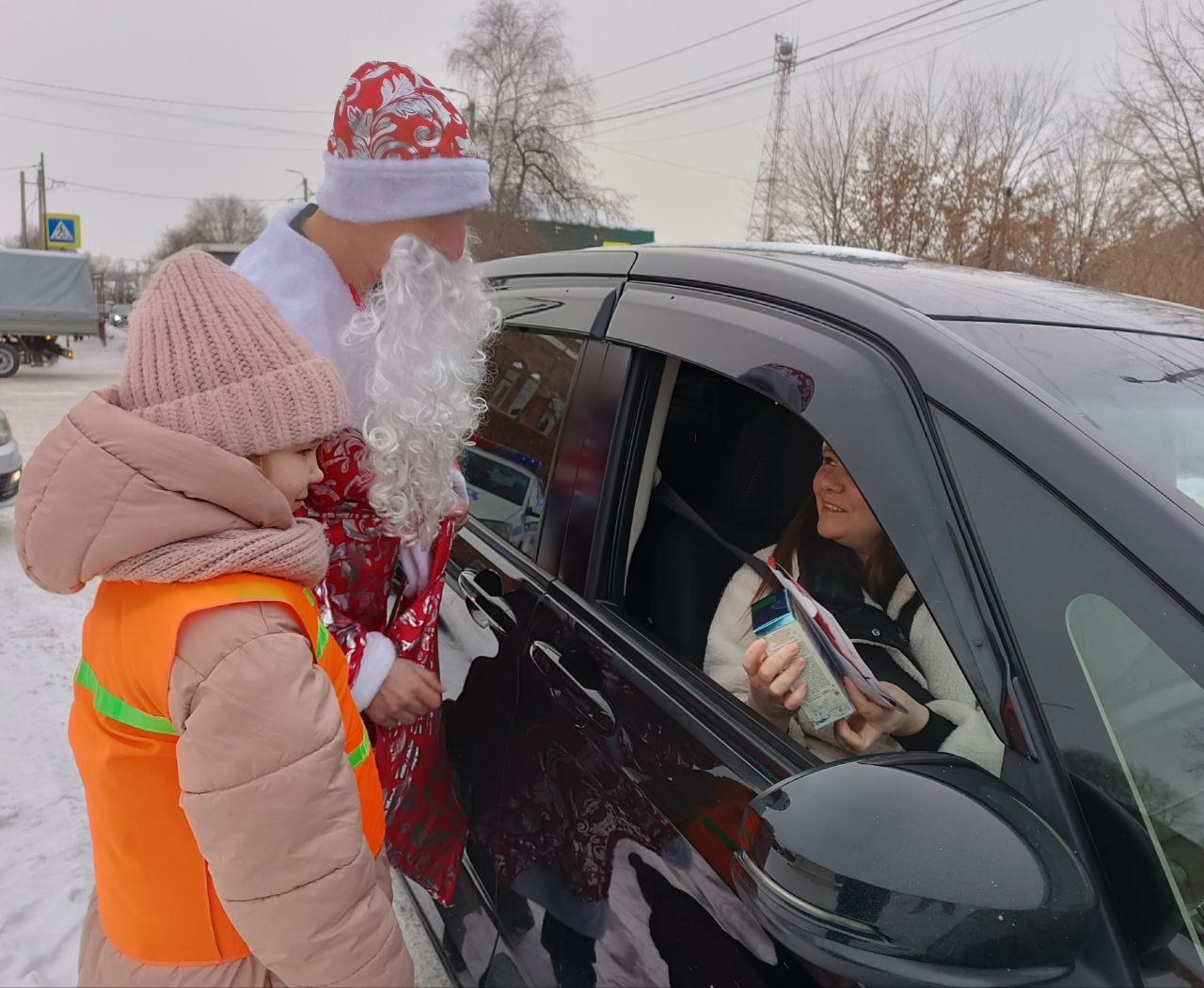 Дед Мороз вместе с ЮИДовцами призывали автолюбителей к строгому соблюдению ПДД, использованию ремней безопасности и детских автокресел, а также желали безопасных поездок.