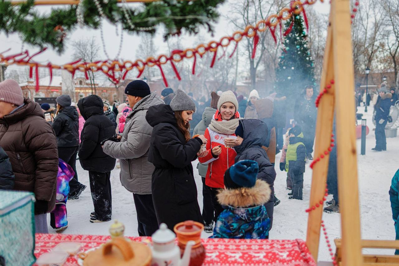 Мероприятие в «Троицком» поддержали и другие партнёры. Например, артисты городского Дворца культуры исполнили новогодние песни, а сотрудники краеведческого музея внесли тёплую и познавательную ноту: они организовали в парке локацию, где можно было вспомнить старинные игры и попробовать чай из настоящего самовара. Кстати, пункты с горячим чаем и угощениями были организованы для всех гостей.