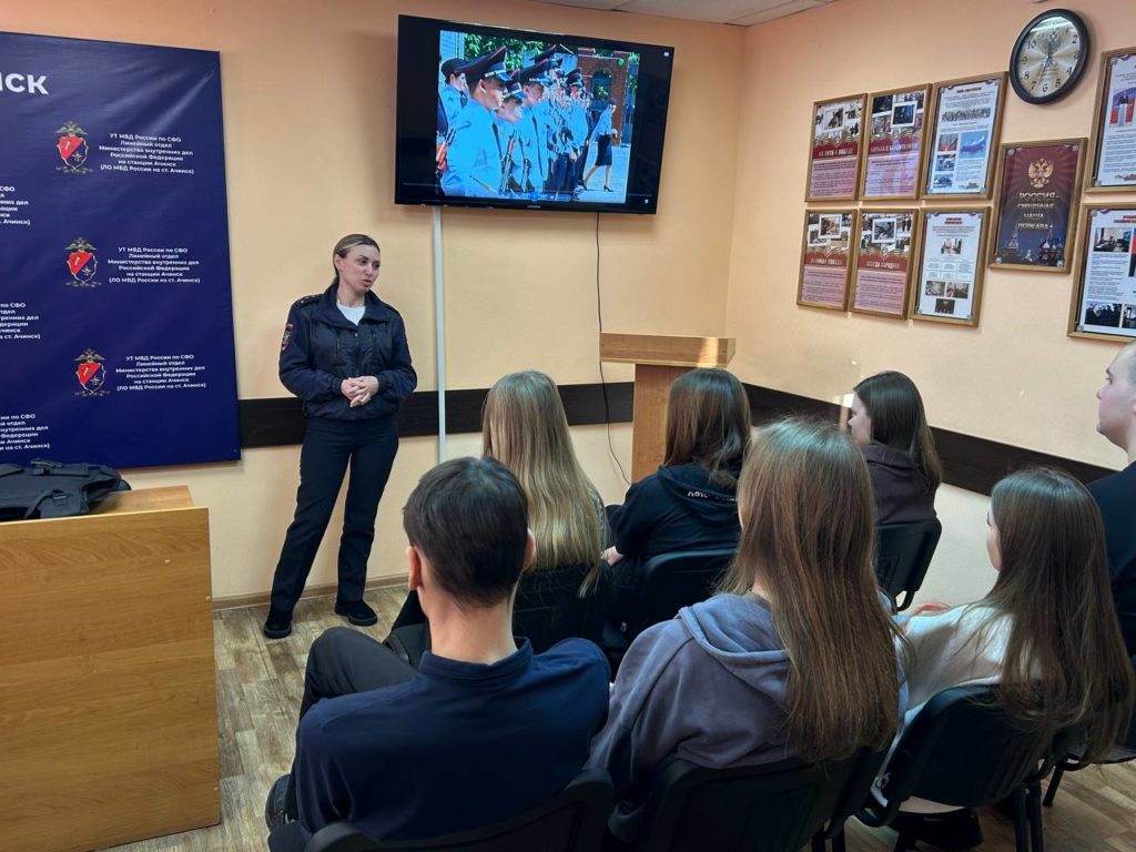 Инспектор отделения охраны общественного порядка Полина Гузева рассказала ребятам об особенностях, задачах и функциях патрульно- постовой службы полиции, после чего ребята задали вопросы которые их интересовали о службе в полиции.