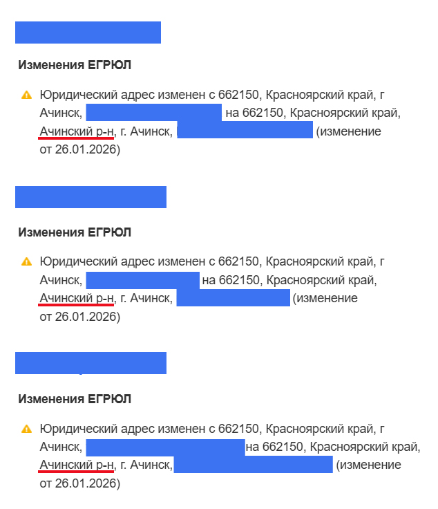 Накануне руководители с удивлением обнаружили, что с 26 января у предприятий автоматически изменились юридические адреса: если раньше там было указано «г. Ачинск», то теперь перед ним добавился «Ачинский р-он».