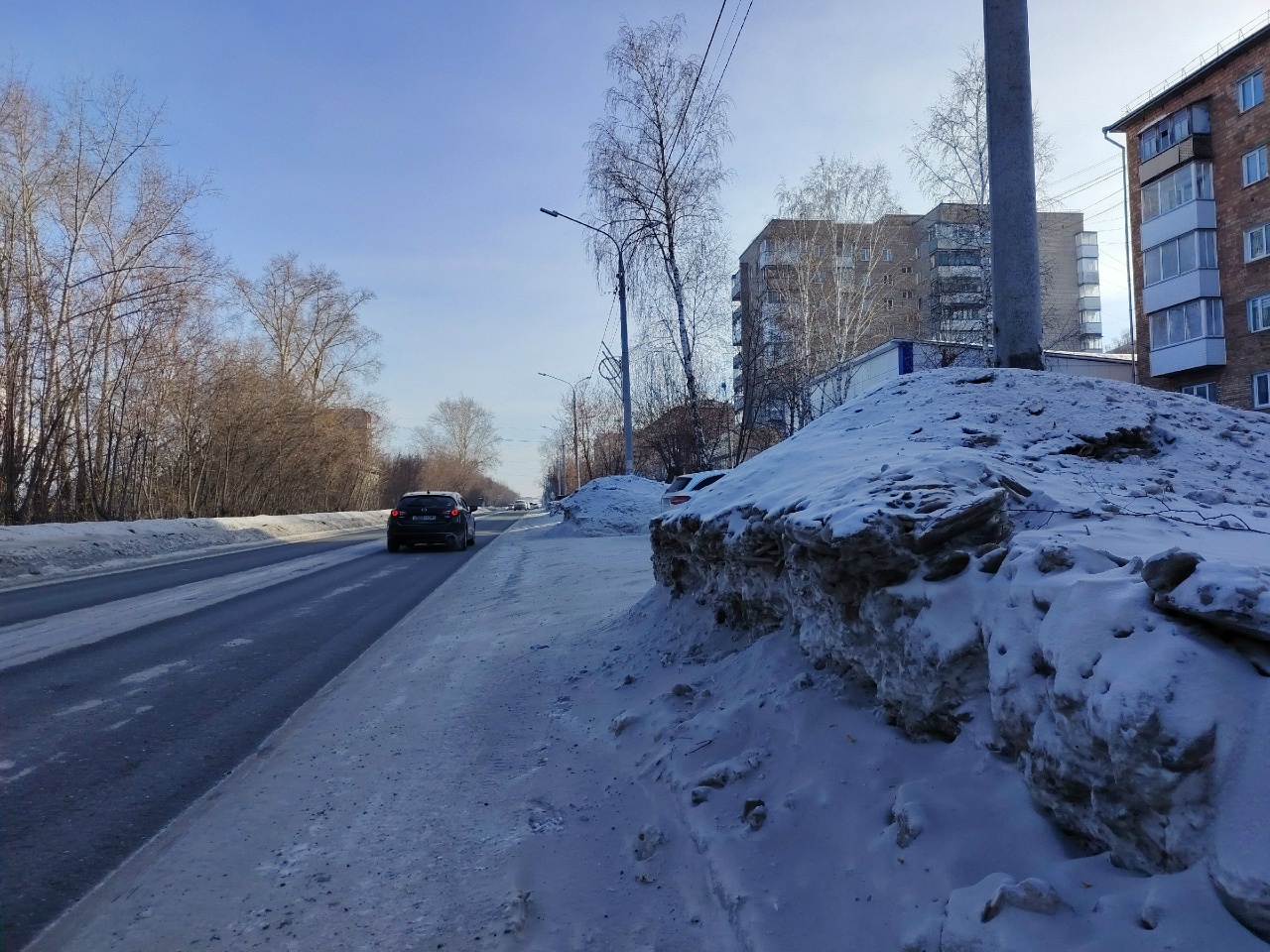 Улица Кирова: дорожное полотно – в норме, а вот снежные отвалы, мягко скажем, «слегка» мешают водителям выезжать из парковочных карманов.