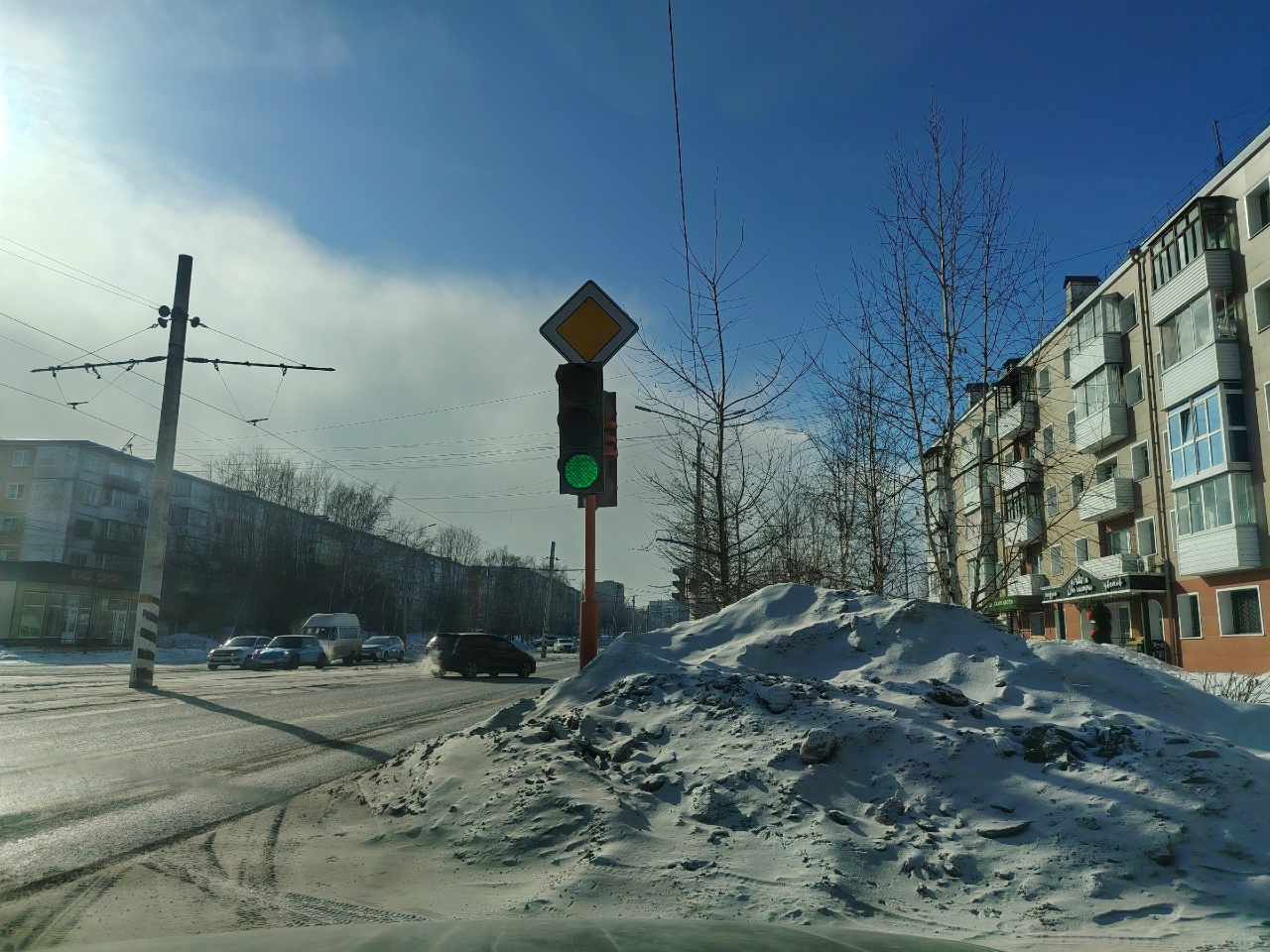 Улица Кравченко: ситуация с снежным завалом тут, как и на улице Кирова. Помимо создания помехи автомобилистам, серая горка снега совсем не служит украшением города.