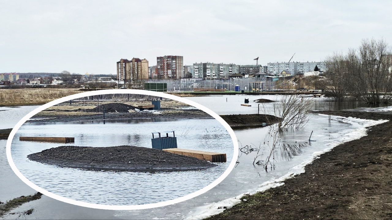 Добраться до некоторых лавочек и урн можно только вплавь. Случилось то, о чём подрядчик говорил всё прошлое лето: возле спортплощадки будет стоять вода. Если остальные недостатки можно вполне оперативно исправить, то что делать с этим «озером» – пока не понятно.