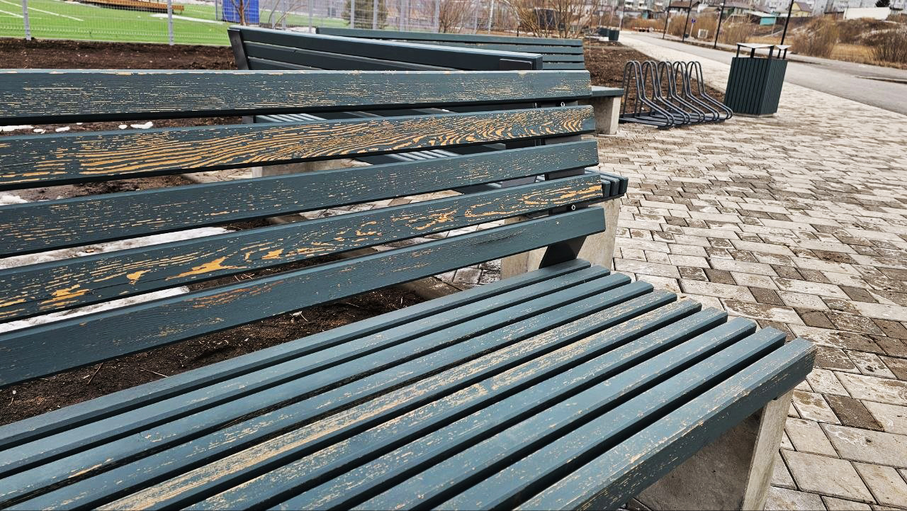 Некоторые лавочки облезли так, будто они стоят здесь уже несколько лет. А на самом деле на них ещё толком никто и не сидел. Тоже подрядчику надо бы обратить внимание, причём в самое ближайшее время.