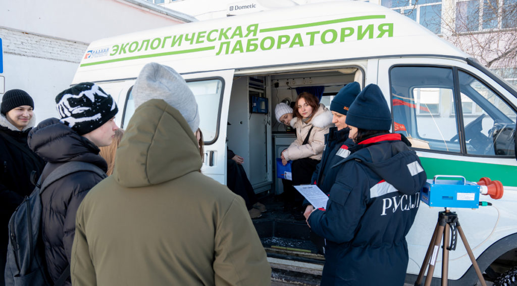 Сотрудники АГК наглядно показали девятиклассникам работу мобильной лаборатории, которая ежедневно мониторит состояние воздушной среды и осуществляет контроль соблюдения экологических норм на промышленной площадке комбината, а также на границе санитарно-защитной зоны предприятия и в городе.